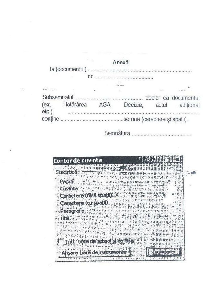- Contor de cuvinte – in care vor fi specificate numarul de semne ale documentelor depuse (Ex. Hotararea AGA, Decizia, Actul aditional etc.) - comerciantii au obligatia sa anexeze la documentul care se va publica in Monitorul Oficial, modelul Contorului de cuvinte cuprinzand numarul total de de semne, respectiv 2000 de semne/pagina de manuscris (caractere si spatii).