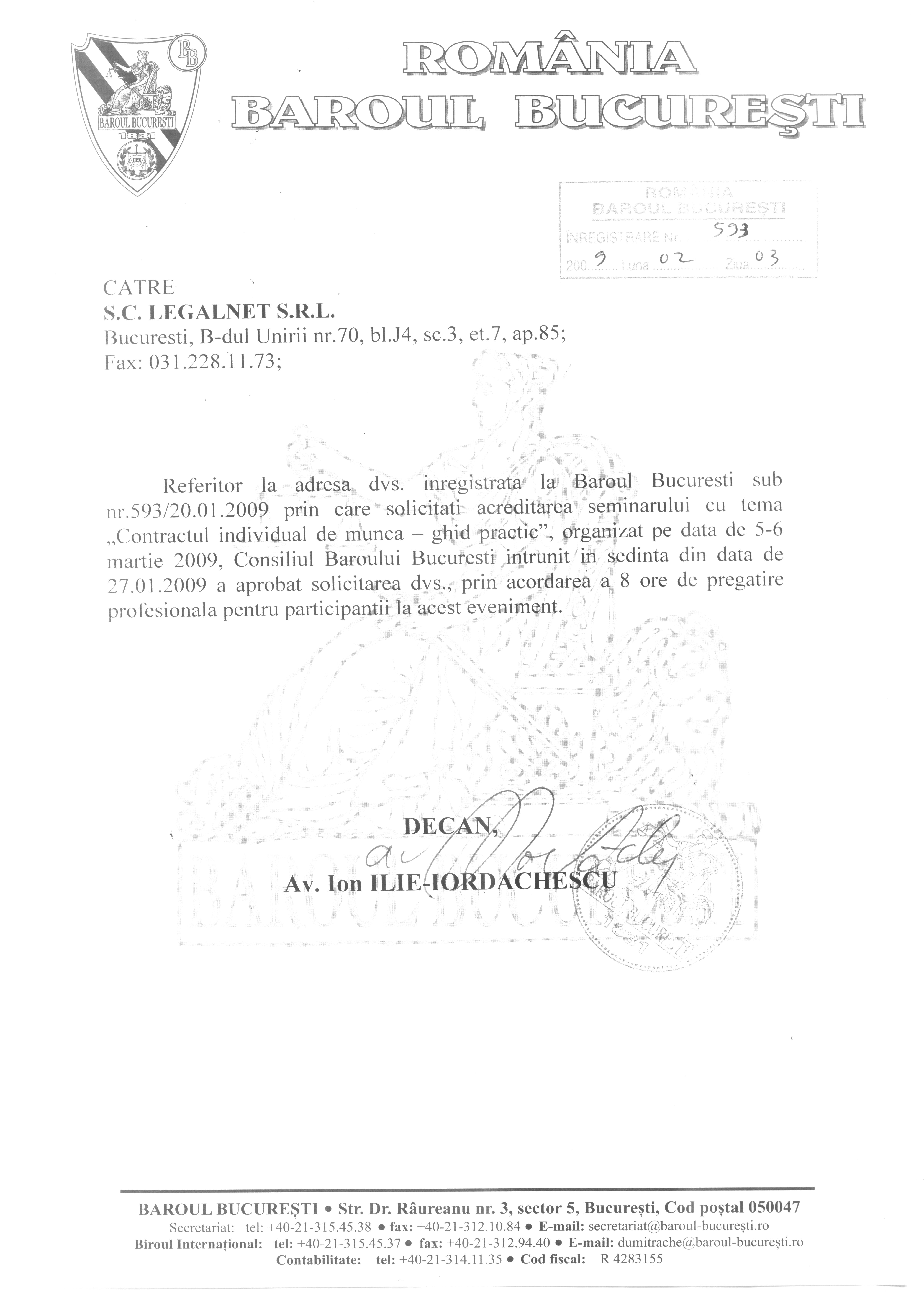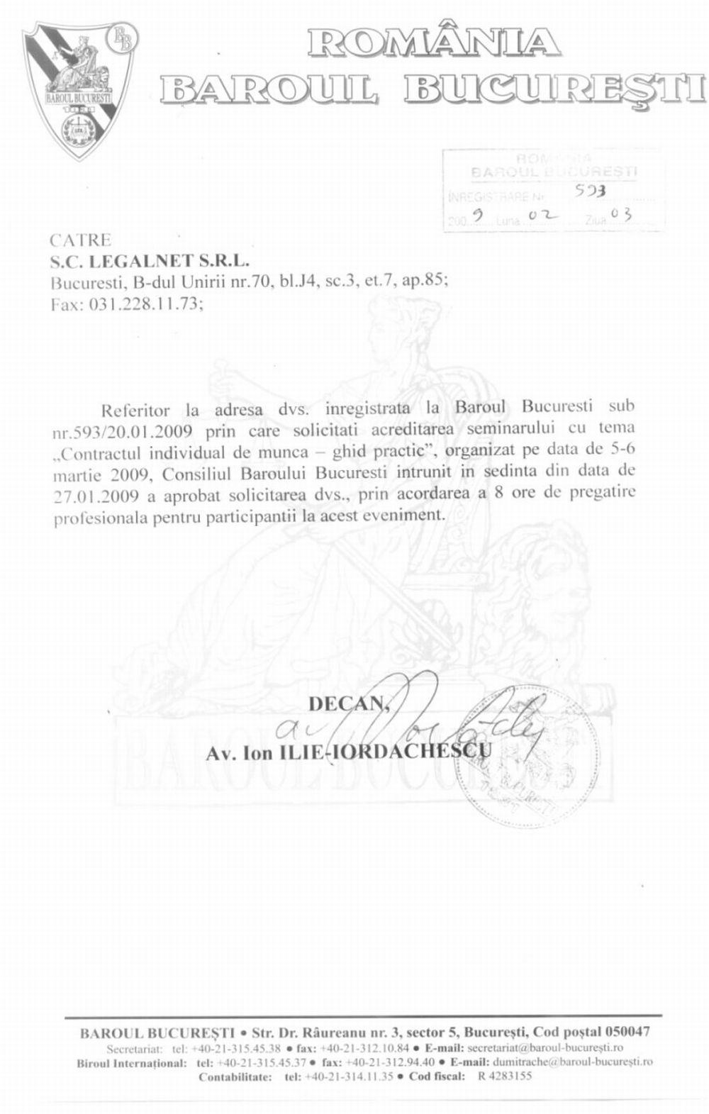 Baroul Bucuresti a acreditat Seminarul “Contractul individual de munca, ghid practic”, iar avocatii participanti vor avea o activitate echivalata cu 8 ore de formare profesionala continua (vezi fisier atasat).