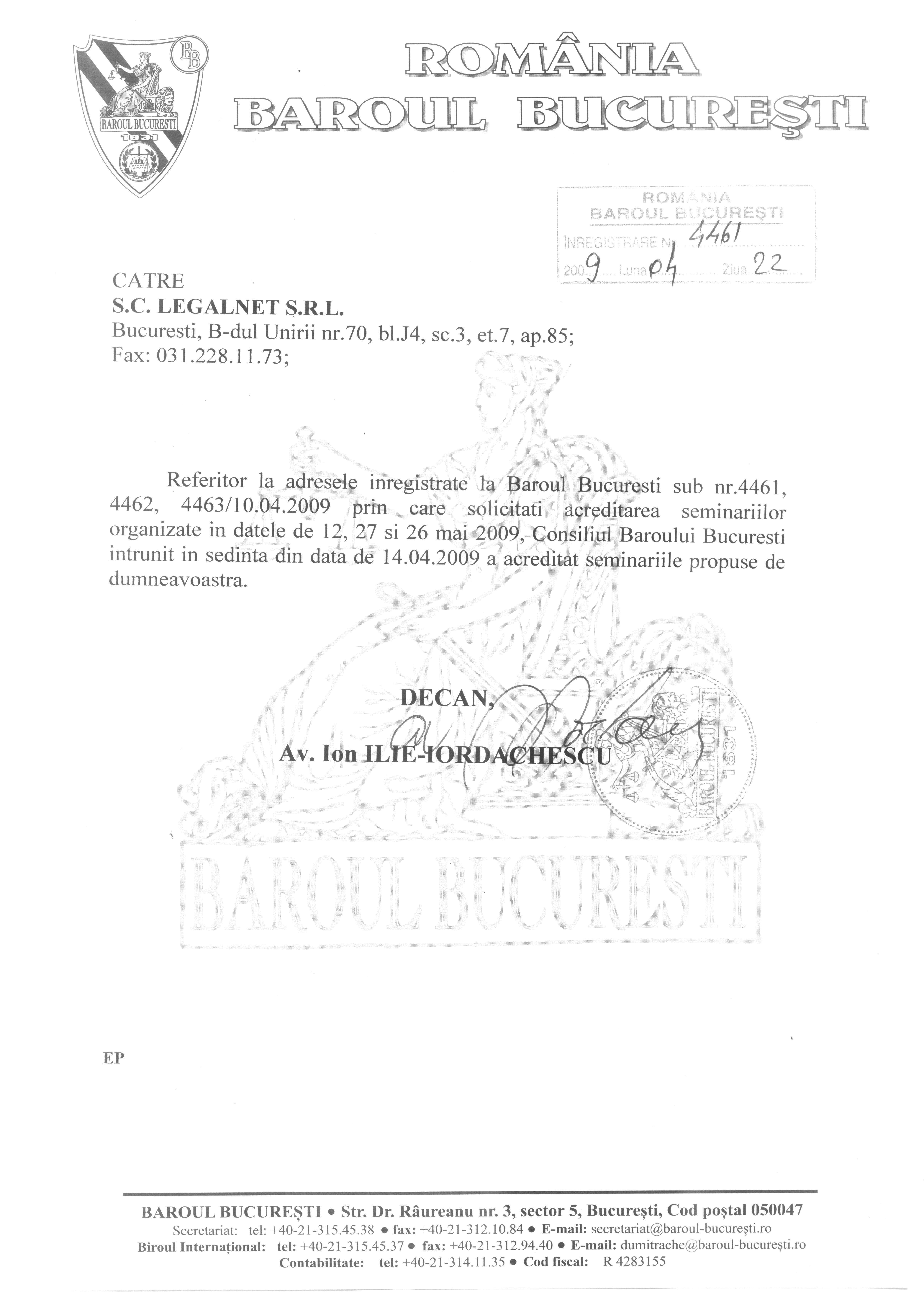 Seminarul a fost acreditat de Baroul Bucuresti, in cadrul programului de formare profesionala continua a avocatilor. Numarul de puncte acordat va fi stabilit ulterior, de catre Consiliul Baroului Bucuresti (vezi fisierul atasat).