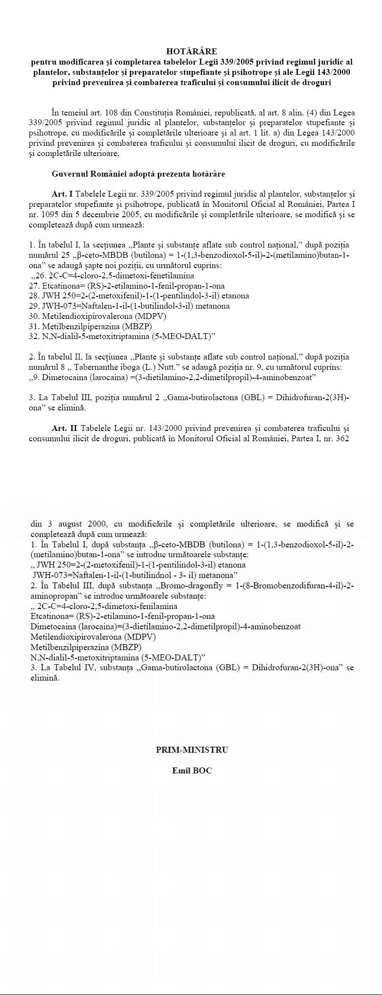 Proiectul de Hotarare pentru modificarea si completarea tabelelor Legii 339/2005 privind regimul juridic al plantelor, substantelor si preparatelor stupefiante si psihotrope si ale Legii 143/2000 privind prevenirea si combaterea traficului si consumului ilicit de droguri interzice interzice de la comercializare alte sapte substante, precum si o planta cu efect psihoactiv.