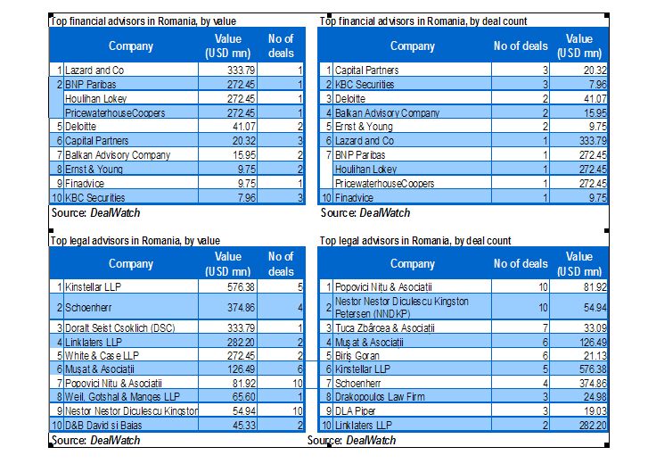 Topul consultantilor legali este condus de Kinstellar LLP care a asistat tranzactii in valoare de 576,38 milioane de dolari. Urmeaza Schoenherr cu tranzactii de 374,86 milioane de dolari si Doralt Seist Csoklich (DSC) cu tranzactii de 333,79 milioane de dolari.
