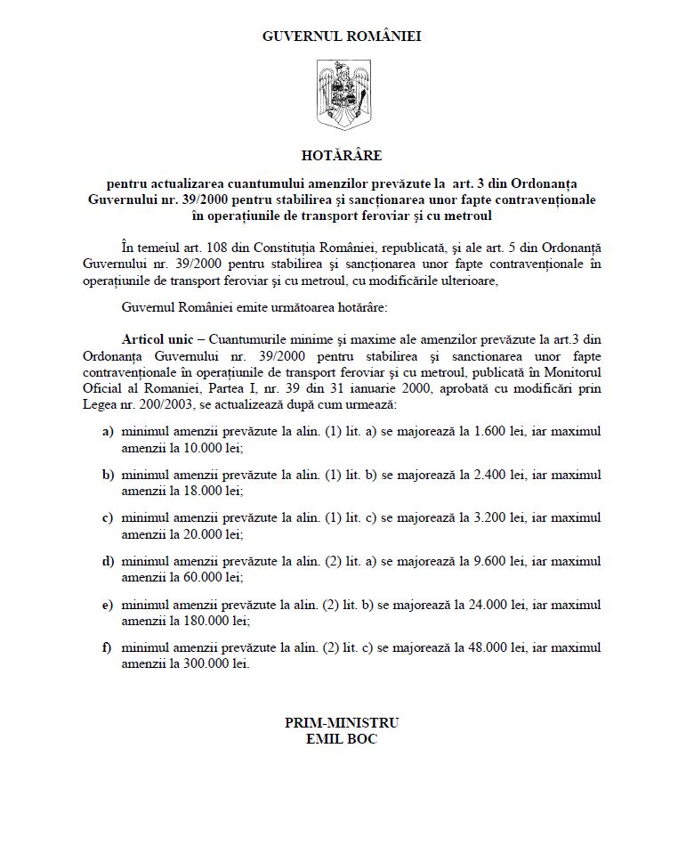 actualizarea amenzilor prevazute de OG nr. 39/2000. Conform ordonantei respective, atat transportul cu trenul, cat si cu metroul, precum si serviciile conexe acestora, sunt considerate activitati de transport feroviar. Actul normativ stabileste faptele persoanelor fizice si juridice care, in desfasurarea activitatii lor, incalca normele privind siguranta circulatiei, securitatea transporturilor, calitatea produselor si a serviciilor, precum si protectia mediului in transportul feroviar.