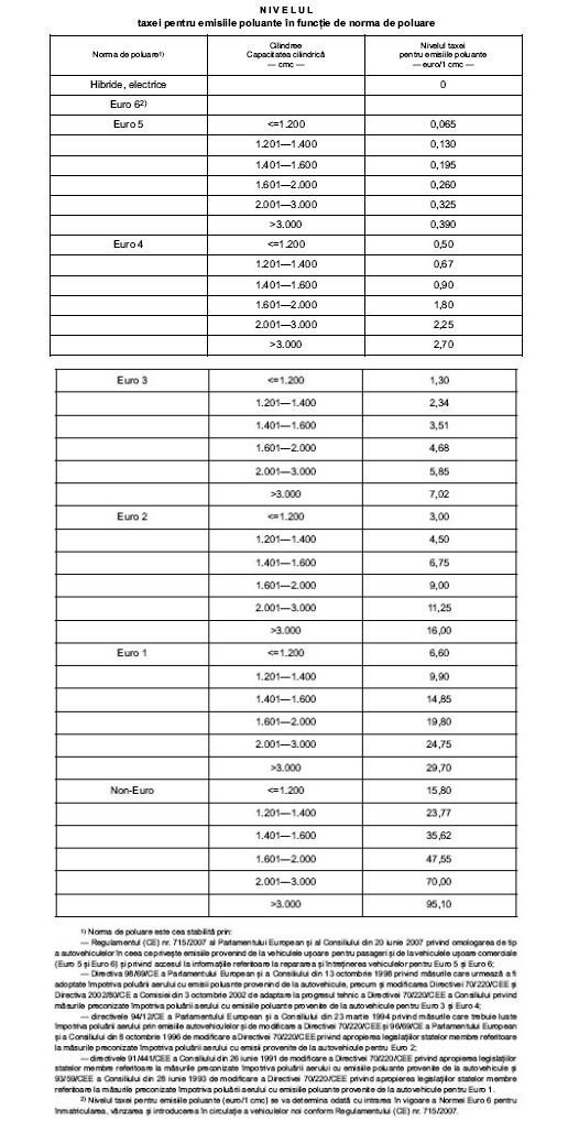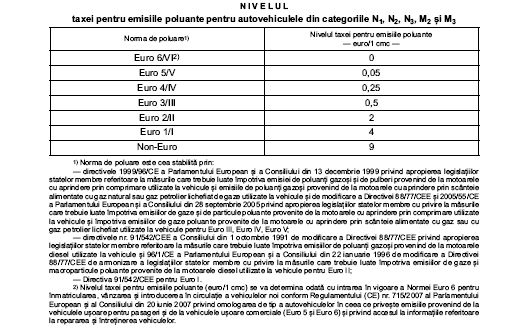 norme de poluare Euro 3, Euro 4, Euro 5 sau Euro 6, taxa se calculeaza dupa formula: