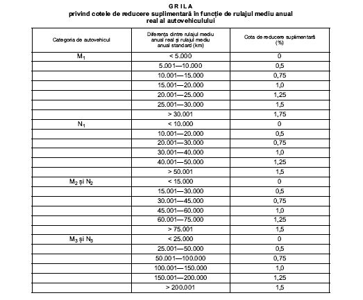In plus, pot fi acordate si reduceri suplimentare fata de cotele prevazute in Anexa 4, "in functie de abaterile de la situatia standard a elementului/ elementelor care a/au stat la baza stabilirii cotei fixe, daca persoana care solicita inmatricularea sau, dupa caz, prima transcriere a dreptului de proprietate asupra unui autovehicul rulat declara pe propria raspundere ca rulajul mediu anual real al autovehiculului in cauza este mai mare decat rulajul mediu anual considerat standard pentru categoria respectiva de autovehicule, potrivit normelor metodologice de aplicare a prezentei legi. in acest caz, calculul taxei se face pe baza cotei de reducere rezultate din cota prevazuta in anexa nr. 4, majorata cu cota de reducere suplimentara prevazuta in anexa nr. 5."