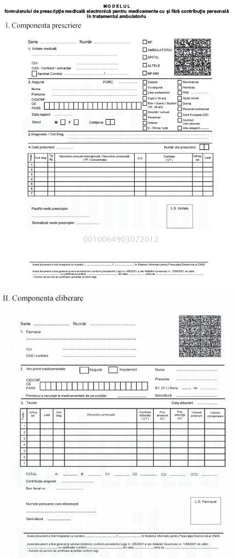 Formularele de prescriptie electronica pentru medicamente cu si fara contributie personala, ce vor fi folosite incepand cu luna iulie, au fost aprobate prin Ordinul Ministerului Sanatatii (MS) nr. 674/2012, act normativ publicat in Monitorul Oficial, Partea I, nr. 439, din 2 iulie 2012.