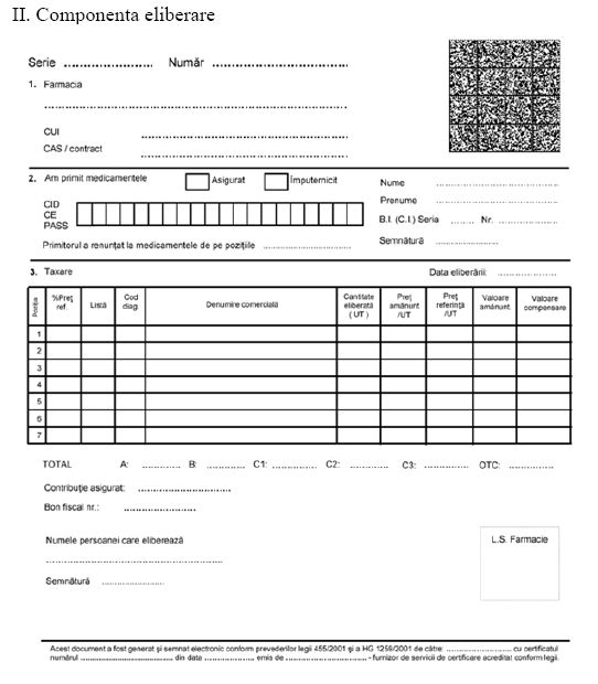 Conform documentului, prescriptia medicala electronica on-line este formularul de prescriptie medicala in format electronic, completat de medic/farmacist folosind o aplicatie informatica dedicata, conectata la Sistemul Informatic pentru Prescriptia Electronica al Casei Nationale de Asigurari de Sanatate, prescriptia fiind validata si inregistrata in forma electronica in sistem inainte de a fi tiparita.