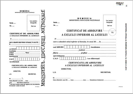 Continutul si formatul actelor de studii care vor fi eliberate absolventilor din sistemul national de invatamant preuniversitar au fost aprobate prin Hotararea Guvernului Romaniei nr. 749/2013 privind aprobarea continutului si formatului actelor de studii care vor fi eliberate absolventilor din sistemul national de invatamant preuniversitar.