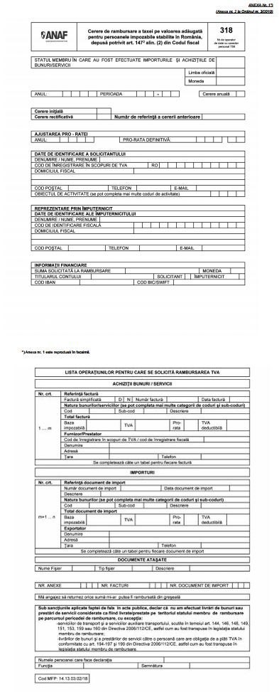 „1.1. Cererea de rambursare se depune de catre persoanele impozabile stabilite in Romania, pentru rambursarea taxei pe valoarea adaugata aferente importurilor si achizitiilor de bunuri/servicii efectuate in alt stat membru al Uniunii Europene.”