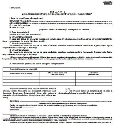 b) declaratie privind incadrarea intreprinderii in categoria intreprinderilor mici si mijlocii, potrivit formularului prevazut in anexa nr. 2, dupa caz;