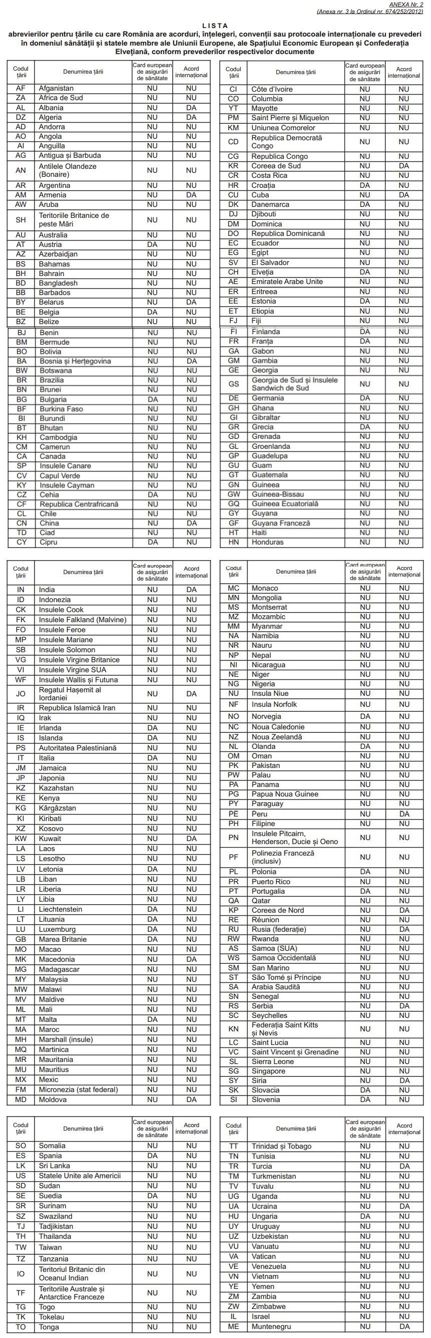 2. La articolul 2, alineatul (3) se modifica si va avea urmatorul cuprins: „(3) Lista abrevierilor pentru tarile cu care Romania are acorduri, intelegeri, conventii sau protocoale internationale cu prevederi in domeniul sanatatii si statele membre ale Uniunii Europene, ale Spatiului Economic European si Confederatia Elvetiana, conform prevederilor respectivelor documente, este prevazuta in anexa nr. 3.” 3. Anexa nr. 1 se modifica si se inlocuieste cu anexa nr. 1, care face parte integranta din prezentul ordin.