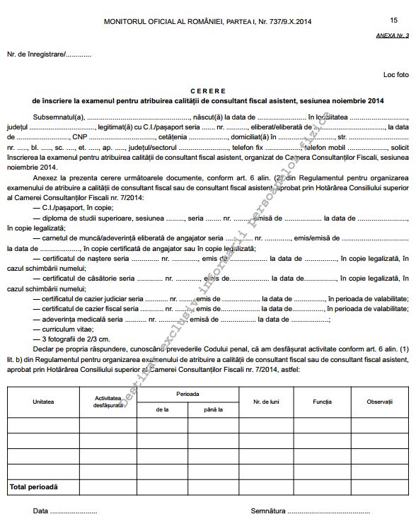 (3) Pentru atribuirea calitatii de consultant fiscal asistent dosarul de inscriere va contine cererea de inscriere la examen, prevazuta in anexa nr. 3, care face parte integranta din prezenta hotarare, si documentele corespunzatoare prevazute la art. 6 alin. (2) din Regulamentul pentru organizarea examenului de atribuire a calitatii de consultant fiscal sau de consultant fiscal asistent, aprobat prin Hotararea Consiliului superior al Camerei Consultantilor Fiscali nr. 7/2014.