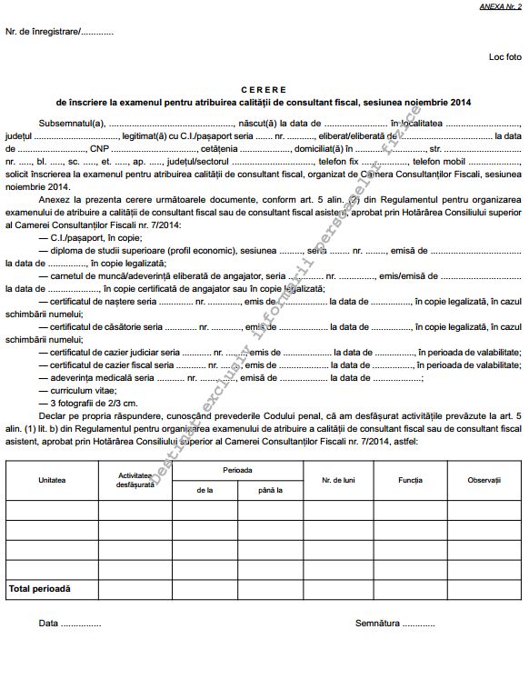 (2) Pentru atribuirea calitatii de consultant fiscal dosarul de inscriere va contine cererea de inscriere la examen, prevazuta in anexa nr. 2, care face parte integranta din prezenta hotarare, si documentele corespunzatoare prevazute la art. 5 alin. (2) din Regulamentul pentru organizarea examenului de atribuire a calitatii de consultant fiscal sau de consultant fiscal asistent, aprobat prin Hotararea Consiliului superior al Camerei Consultantilor Fiscali nr. 7/2014