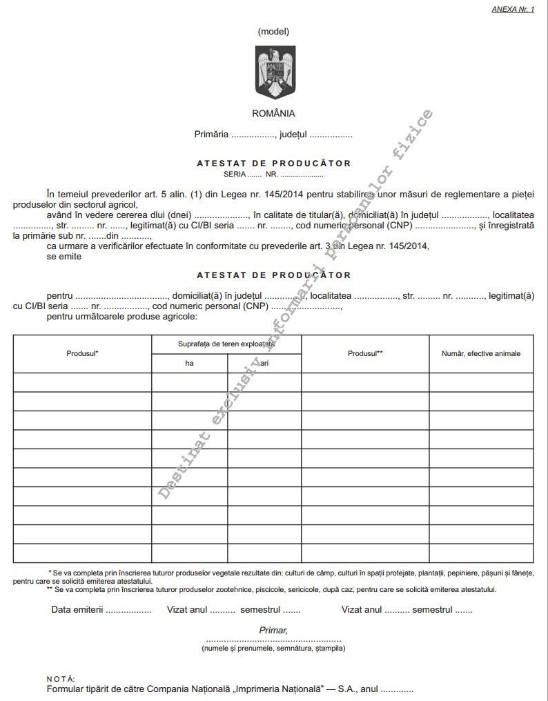 Concret, certificatele emise in temeiul HG nr. 661/2001 au putut fi utilizate pana la expirarea perioadei de valabilitate a vizei aplicate pe acestea, dar nu mai tarziu de 180 de zile de la data intrarii in vigoare a Legii nr. 145/2014, adica pana la data de 1 mai 2015. Practic, incepand cu aceasta data, atestatul de producator a devenit obligatoriu. Modelul acestui act a fost aprobat prin Ordinul ministrului agriculturii nr. 1846/2014, publicat in Monitorul Oficial, Partea I, nr. 881 din 4 decembrie 2014, si il puteti consulta in fisierul atasat.