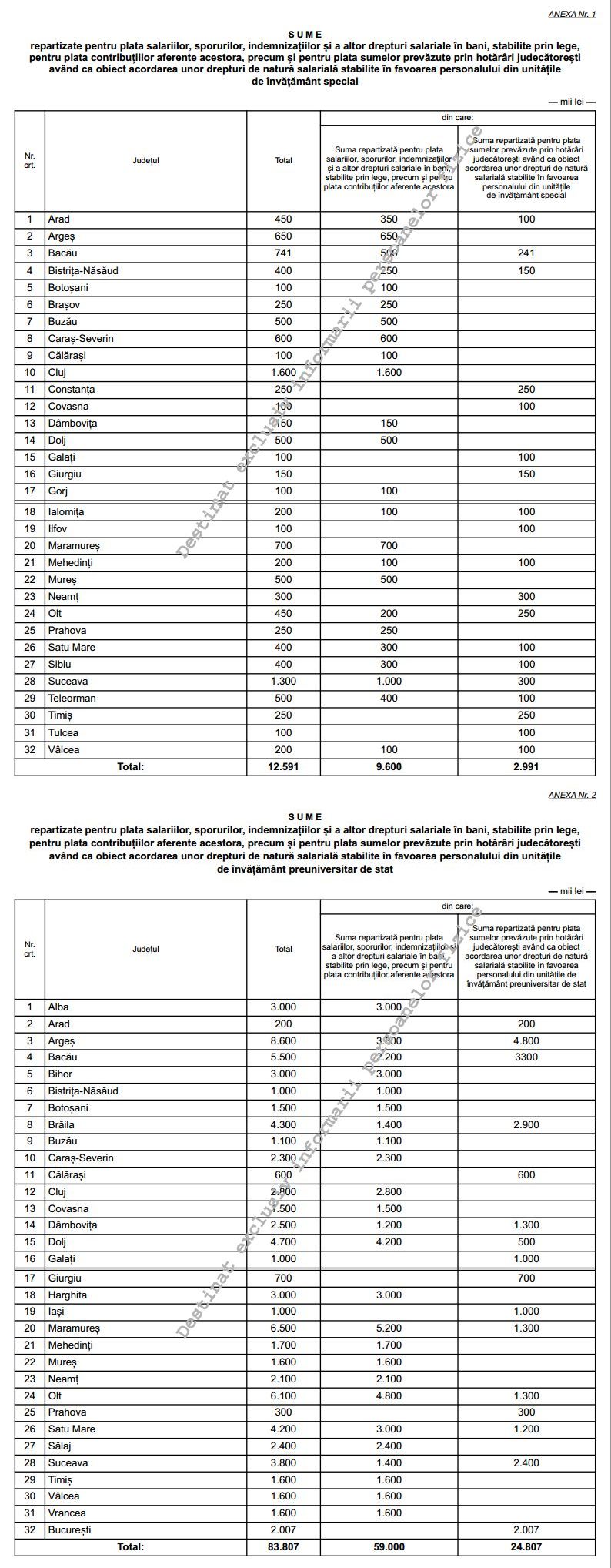 (2) Din sumele rezervate prevazute la pozitia 43 din anexa nr. 4 la Ordonanta Guvernului nr. 9/2014, cu modificarile si completarile ulterioare, se repartizeaza pe judete suma totala de 83.807 mii lei, din care 59.000 mii lei pentru plata salariilor, sporurilor, indemnizatiilor si a altor drepturi salariale in bani stabilite prin lege si pentru plata contributiilor aferente acestora, iar 24.807 mii lei pentru plata sumelor prevazute prin hotarari judecatoresti avand ca obiect acordarea unor drepturi de natura salariala stabilite in favoarea personalului din unitatile de invatamant preuniversitar de stat, potrivit anexei nr. 2, care face parte integranta din prezenta hotarare.