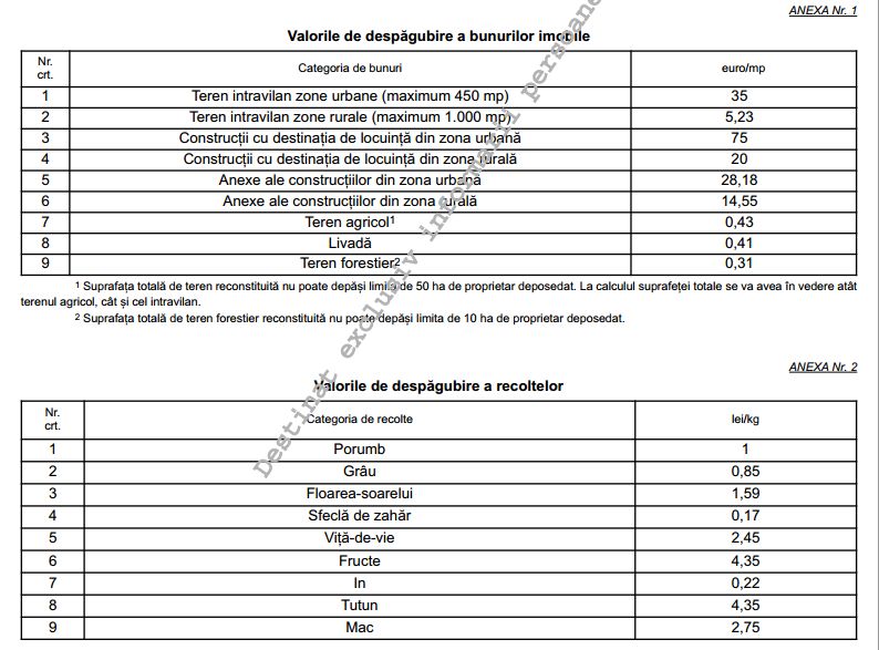 (2) Pentru trei dintre recoltele neculese in anul parasirii proprietatilor in teritoriile prevazute in Legea nr. 290/2003, cu modificarile si completarile ulterioare, la alegerea fostilor proprietari sau a mostenitorilor acestora, se acorda despagubiri al caror cuantum se stabileste de catre comisiile judetene, respectiv a municipiului Bucuresti pentru aplicarea Legii nr. 290/2003, cu modificarile si completarile ulterioare, prin raportare la valorile prevazute in anexa nr. 2.