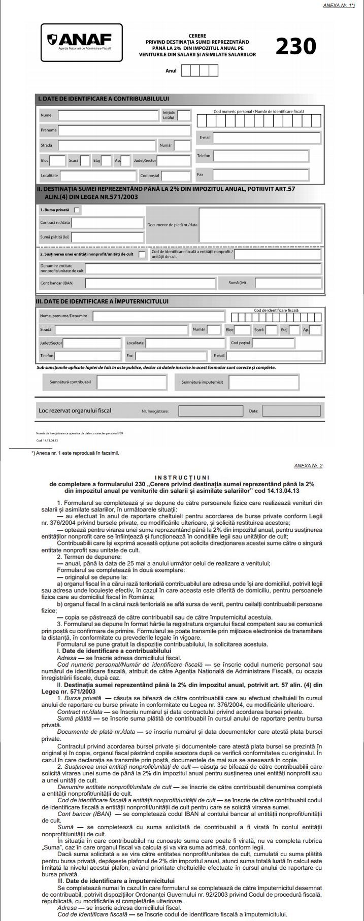 2. La anexa nr. 1, formularul 230 „Cerere privind destinatia sumei reprezentand pana la 2% din impozitul anual si deducerea cheltuielilor efectuate pentru economisirea in sistem colectiv pentru domeniul locativ”, cod 14.13.04.13, se modifica si se inlocuieste cu formularul prevazut in anexa nr. 1.