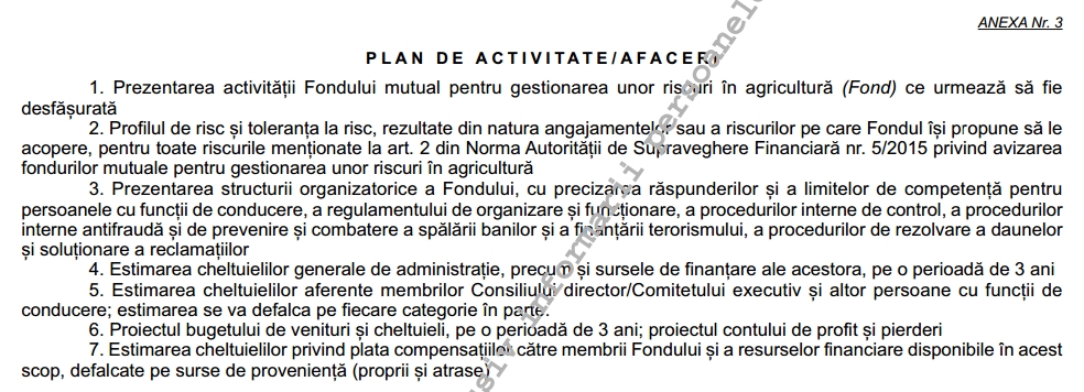 e) un plan de activitate/afaceri pentru o perioada de 3 ani de la data depunerii cererii prevazute la lit. a), care trebuie sa cuprinda cel putin informatiile prevazute in anexa nr. 3;