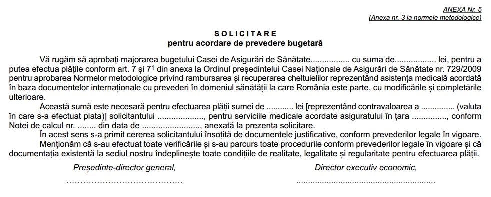 (10) Rambursarea contravalorii asistentei medicale suportate pentru asiguratul din sistemul de asigurari sociale de sanatate din Romania se efectueaza de catre casa de asigurari de sanatate care a intocmit solicitarea de acordare de prevedere bugetara, in lei, in termen de maximum 60 de zile de la data alocarii de prevedere bugetara.