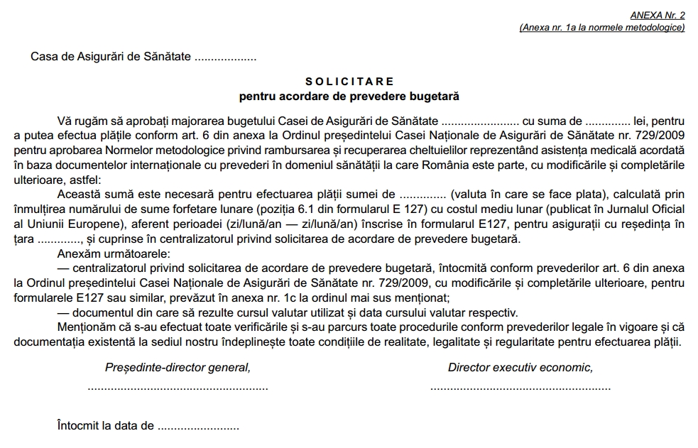 (2) Pentru alocarea de prevederi bugetare se utilizeaza, dupa caz, modelul de solicitare pentru acordare de prevedere bugetara prevazut in anexa nr. 1, respectiv in anexa nr. 1a, insotit de centralizatorul privind solicitarea de acordare de prevedere bugetara completat conform modelului prevazut in anexa nr. 1b, respectiv in anexa nr. 1c.”