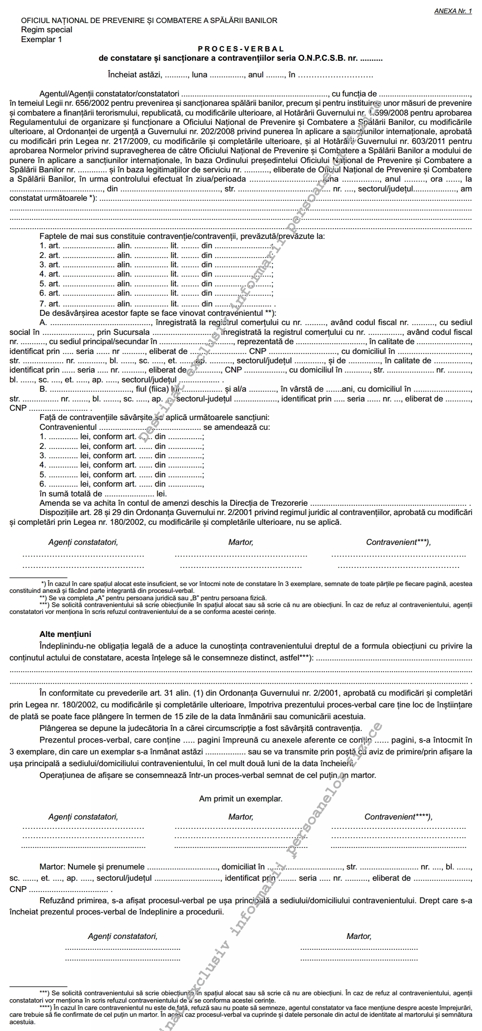 Art. 1. - Se aproba modelul si continutul formularului tipizat „Proces-verbal de constatare si sanctionare a contraventiilor” utilizat de personalul Oficiului National de Prevenire si Combatere a Spalarii Banilor cu atributii de control, prevazut in anexa nr. 1 care face parte integranta din prezentul ordin.