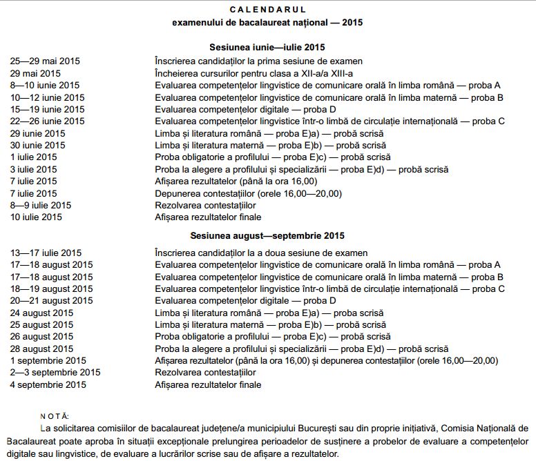 Anexa cu calendarul examenului de Bacalaureat national – 2015 poate fi consultata in fisierul alaturat.
