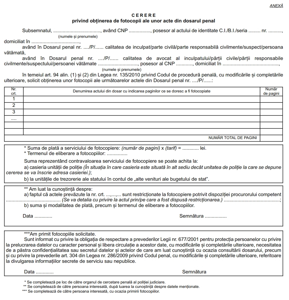 Art. 7. - (1) Persoanele interesate pot solicita realizarea de fotocopii pe baza unei cereri, tip formular, al carei model este prevazut in anexa care face parte integranta din prezentul ordin.