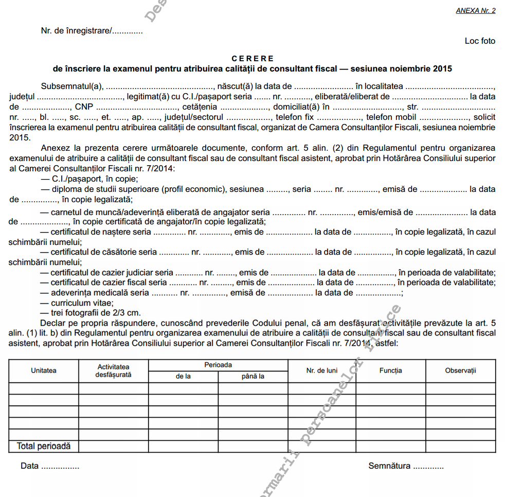 (2) Pentru atribuirea calitatii de consultant fiscal dosarul de inscriere va contine cererea de inscriere la examen, prevazuta in anexa nr. 2, care face parte integranta din prezenta hotarare, si documentele corespunzatoare prevazute la art. 5 alin. (2) din Regulamentul pentru organizarea examenului de atribuire a calitatii de consultant fiscal sau de consultant fiscal asistent, aprobat prin Hotararea Consiliului superior al Camerei Consultantilor Fiscali nr. 7/2014.