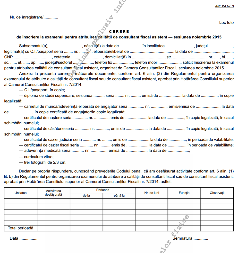 (3) Pentru atribuirea calitatii de consultant fiscal asistent dosarul de inscriere va contine cererea de inscriere la examen, prevazuta in anexa nr. 3, care face parte integranta din prezenta hotarare, si documentele corespunzatoare prevazute la art. 6 alin. (2) din Regulamentul pentru organizarea examenului de atribuire a calitatii de consultant fiscal sau de consultant fiscal asistent, aprobat prin Hotararea Consiliului superior al Camerei Consultantilor Fiscali nr. 7/2014.