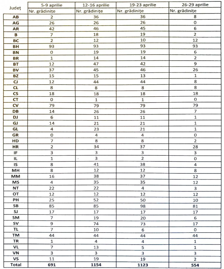 Numărul de grădinițe ce sunt deschise pe perioada vacanței de primăvară în fiecare județ din țară