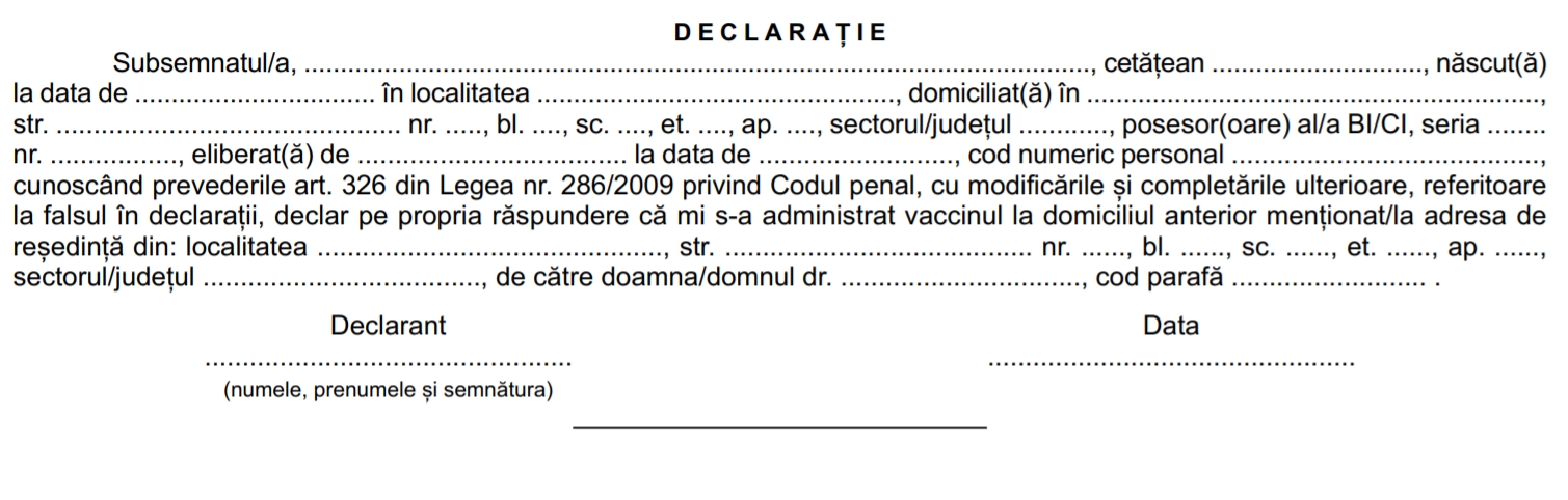 Apoi, medicii de familie trebuie să ia de la cei vaccinați la domiciliu o declaraţie pe proprie răspundere pentru fiecare inoculare (modelul poate fi descărcat de la sfârșitul articolului), care reprezintă, de fapt, un document justificativ ce confirmă vaccinarea şi care trebuie păstrat la cabinetului medical.