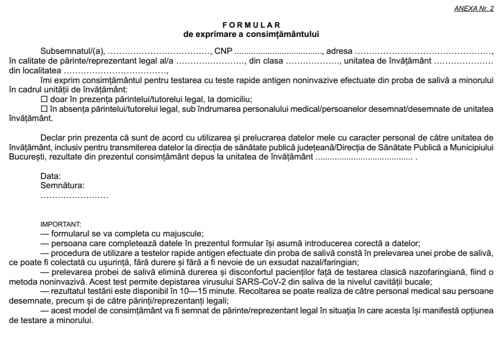 modelul formularului de exprimare a consimțământului părintelui pentru testarea copiilor (poate fi descărcat de la finalul articolului).