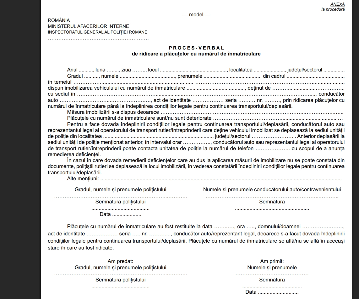 Ordinul apărut recent conține, de altfel, și modelul procesului-verbal de ridicare a plăcuțelor cu numărul de înmatriculare (se poate descărca de la finalul articolului).