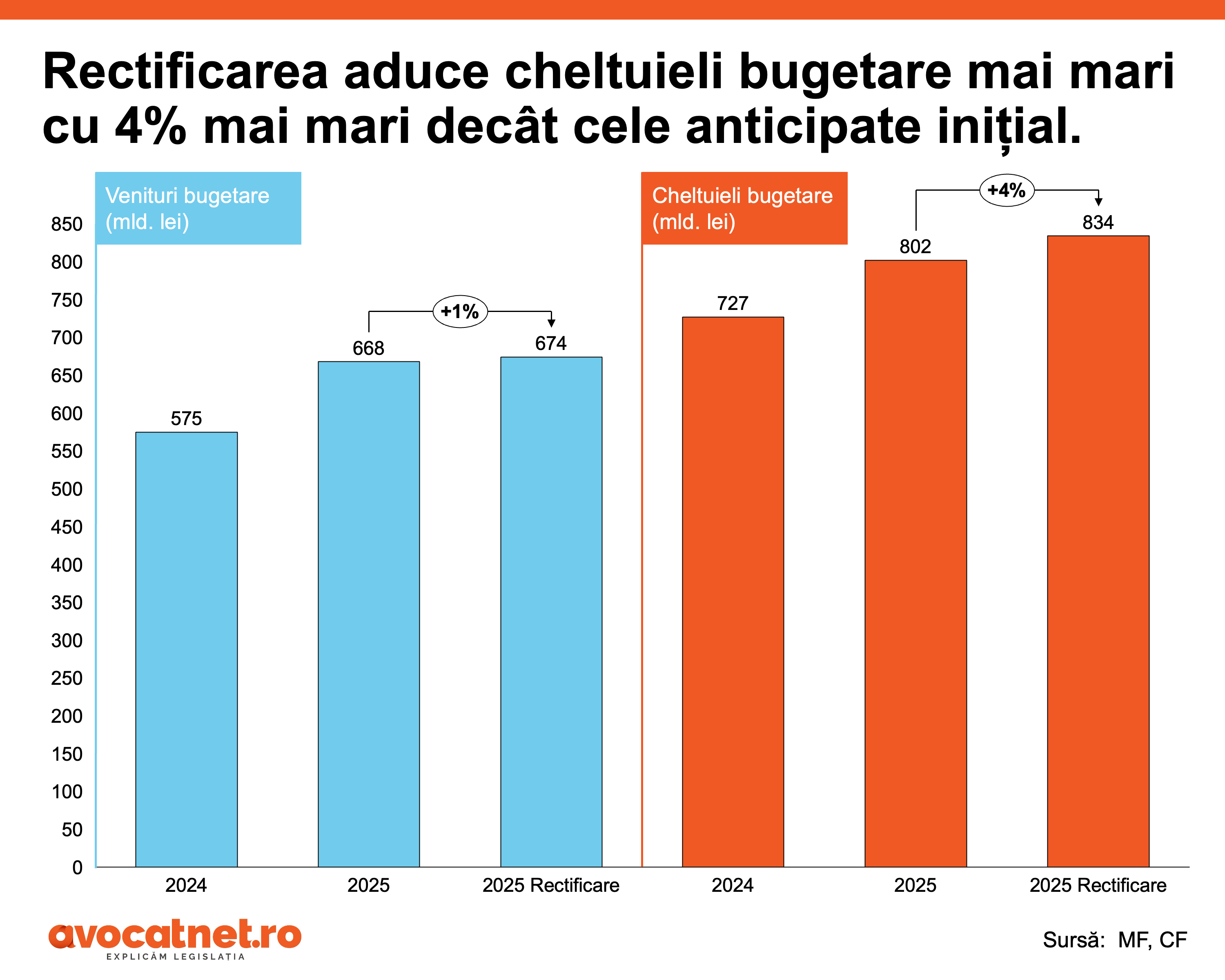 - Rectificarea bugetară 2025 arată creșteri mai mari la cheltuieli (4%) decât la venituri (1%), în special din cauza dobânzilor crescute la împrumuturi și a efectelor majorărilor salariale din 2024.