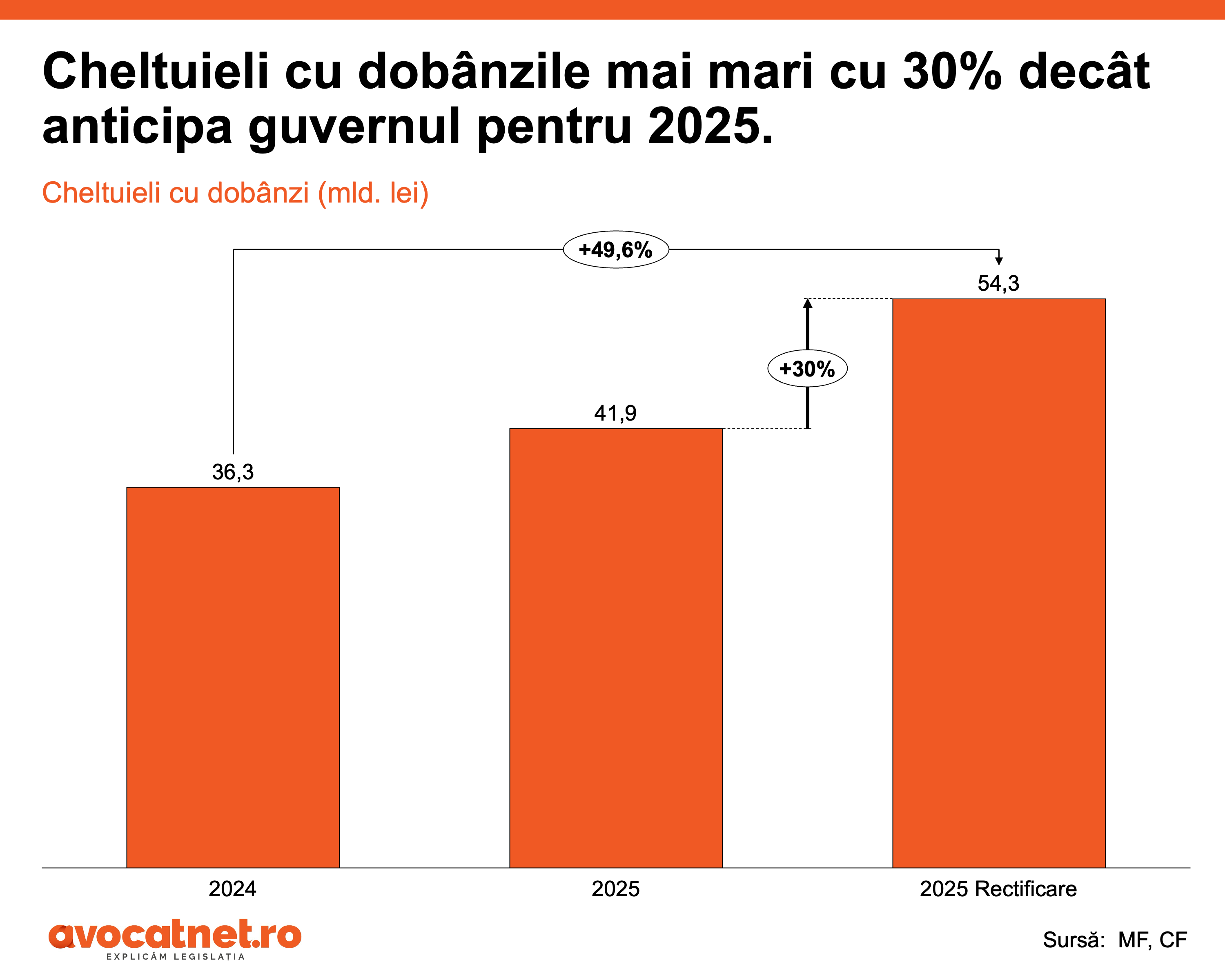 Dincolo de cheltuielile militare, dobânzile riscă să arunce statul român într-o situație dificil de gestionat. Bugetul inițial se aștepta la o creștere a cheltuielilor cu dobânzile de la 36,3 la 41,9 miliarde în perioada 2024 – 2025. În realitate, acestea ar crește cu aproximativ 50% față de anul trecut, ajungând la 54,3 miliarde lei.