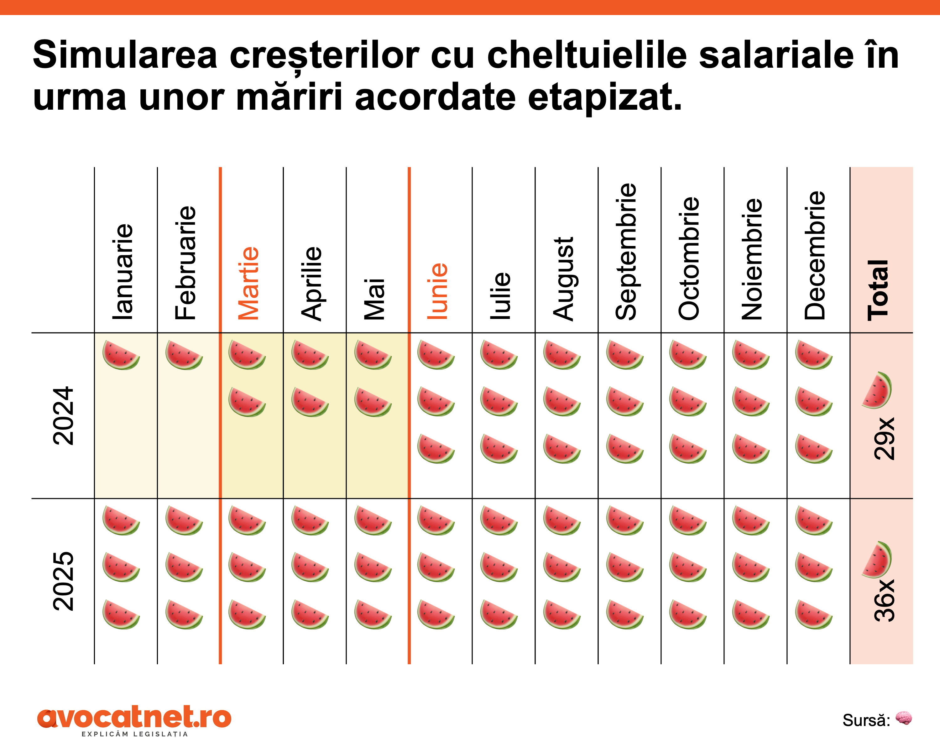 Anul 2025 nu a mai început cu o singură felie, deoarece a beneficiat de creșterile salariale, așa că salariul este de trei felii. Nu s-a schimbat nimic, deoarece pe calea Ordonanței-trenuleț, OUG 156/2024, salariul i-a fost înghețat la nivelul anului precedent. Timp de 12 luni a primit 3 felii de pepene lunar, deci un total de 36 de felii. Ecuația aritmetică indică faptul că, într-adevăr, cheltuielile statului cu acest angajat au crescut de la an la cu 7 felii de pepene (+24%).