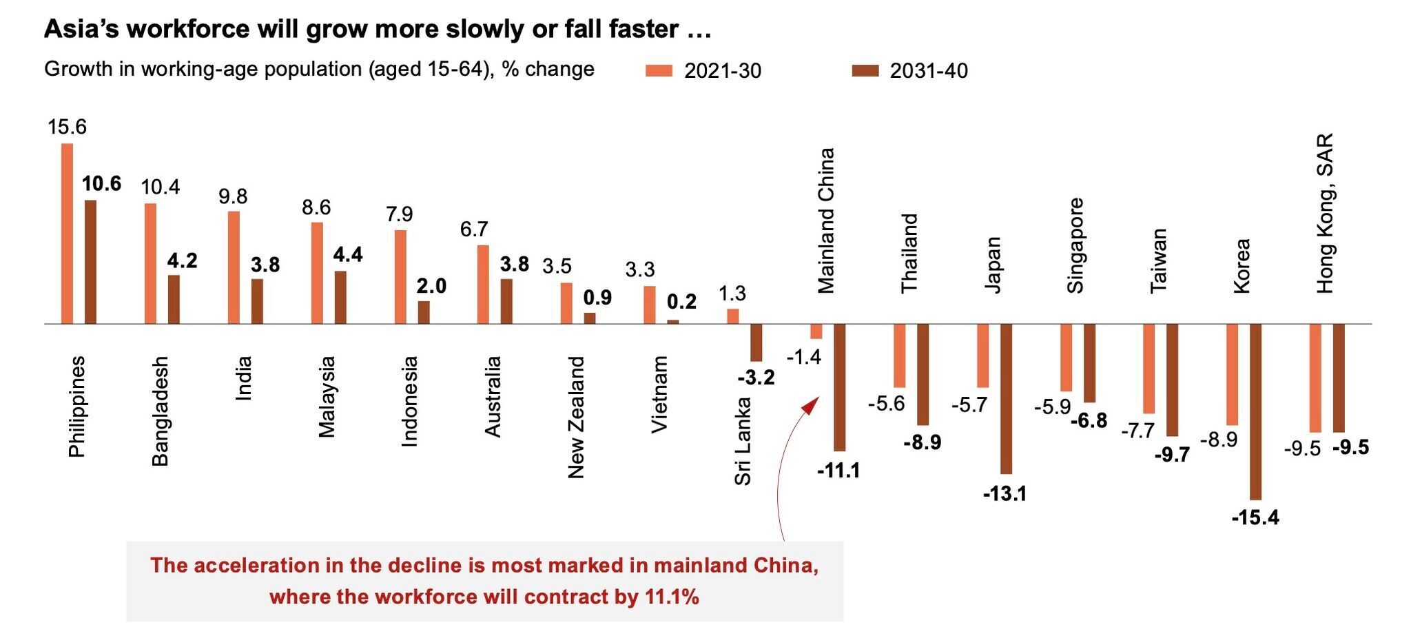 Coreea de Sud se apropie de o pierdere de 30% a populației active până în 2040. China e și ea pe un trend accelerat de scădere, începând cu 2013, anul în care populația cu vârste între 15 și 64 de ani a atins vârful. De atunci este într-un declin constant. Unele estimări spun că, până la sfârșitul secolului, China ar putea ajunge de la 900 de milioane de oameni activi la doar 250 de milioane.