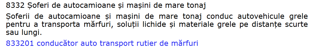 O simplă consultare a Clasificării Ocupațiilor din România (COR), bazată pe standardul internațional ISCO 08 și pe standardul european ESCO, ne arată (așa cum reiese și din imaginea extrasă din COR) că ocupația de „Șofer de autocamioane și mașini de mare tonaj” (Cod COR 833201) presupune exclusiv „a conduce autovehicule grele pentru a transporta mărfuri, soluții lichide și materiale grele pe distanțe scurte sau lungi”.