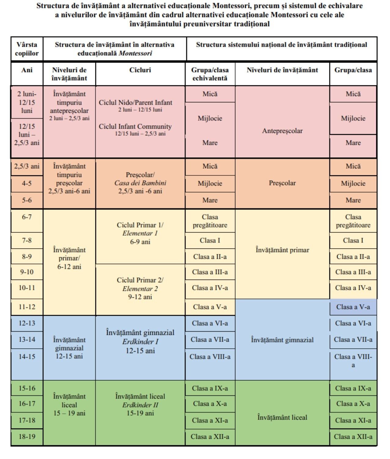 Ordinul apărut recent stabilește și structura de învățământ a alternativei educaționale Montessori, precum și sistemul de echivalare a nivelurilor de învățământ din cadrul alternativei educaționale Montessori cu cele ale învățământului preuniversitar tradițional.