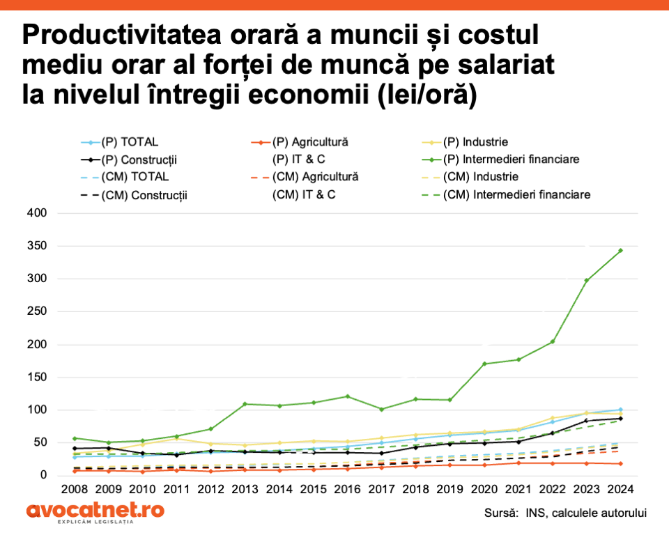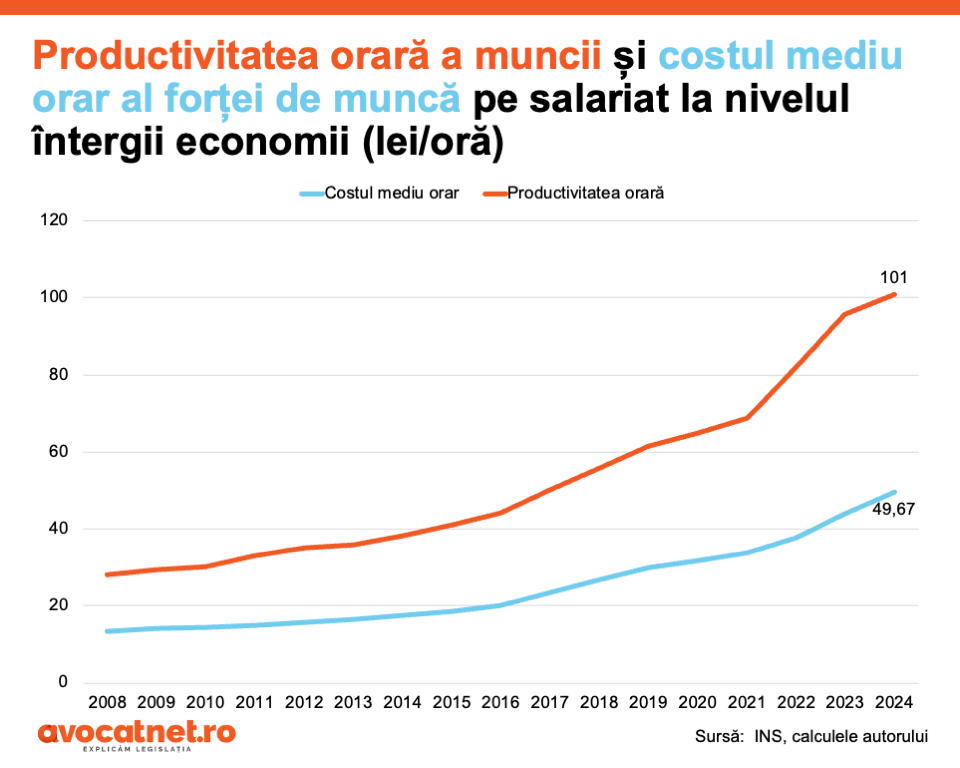 În 2008, costul mediu orar al forței de muncă pe salariat la nivelul întregii economii era de 13,32 lei / oră / angajat, în timp ce productivitatea orară a muncii era de 28,82 lei. În 2024, valoarea costului mediu a ajuns la 49,67 lei (+172%), în timp ce productivitatea medie orară a atins nivelul de 101 lei (+158%).