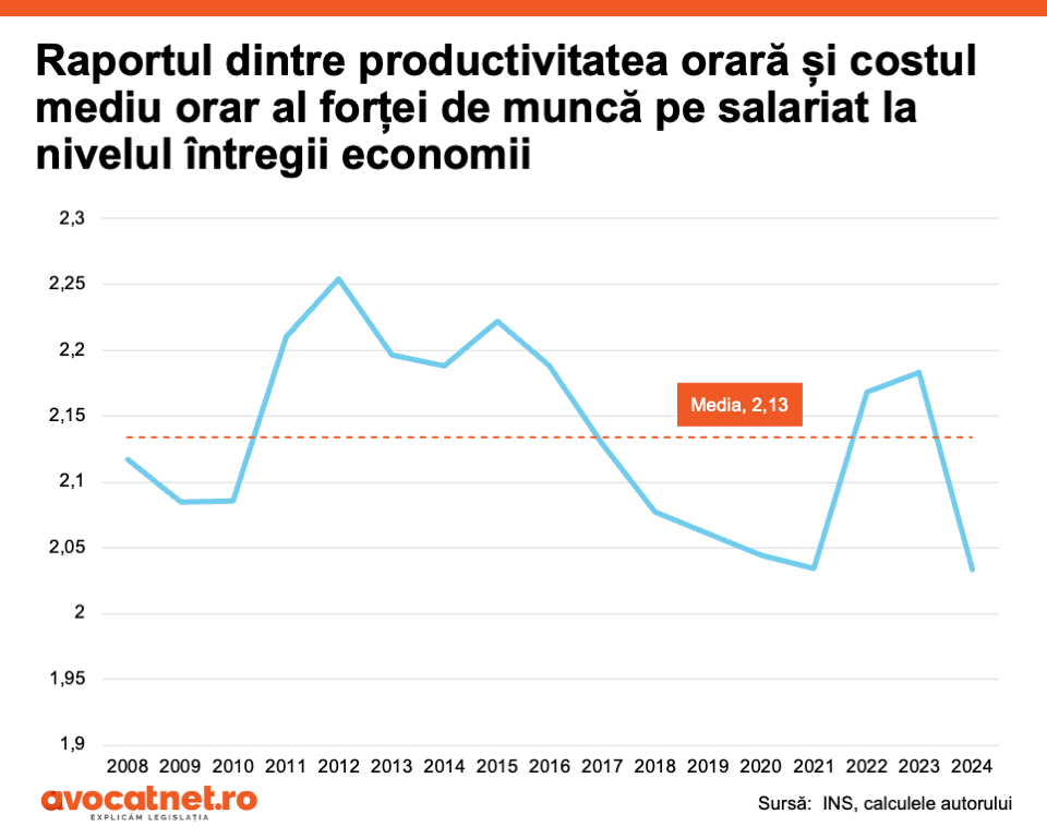 Raportul dintre productivitatea orară a muncii și costul mediu orar al forței de muncă era de 2,12 în 2008, ajungând în 2024 la 2,03 (-4,0%). Simplu spus: în 2008, fiecare leu cheltuit pe salarii genera 2,12 lei valoarea adăugată la nivelul întregii economii.