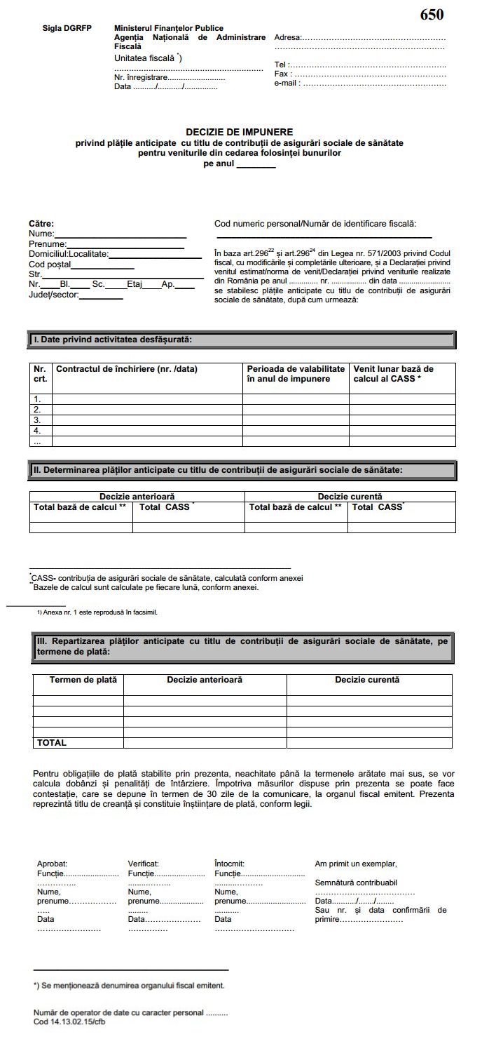 Asa trebuie sa arate decizia de impunere pentru CASS in cazul veniturilor din chirii: